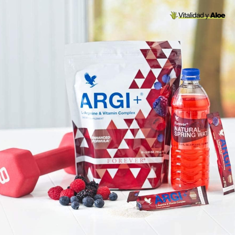 Forever ARGI+ combina L-Arginina con un cóctel único de vitaminas y extractos de frutas. Forever ARGI+ proporciona 5 gramos de L-Arginina por ración, así como vitaminas para dar al cuerpo tono y resistencia. La L-arginina es un aminoácido que desempeña varias funciones importantes en el organismo: ayuda a la división celular, construye proteínas y ayuda al cuerpo a recuperarse tras un esfuerzo prolongado. La vitamina C es esencial para mantener la función del sistema inmunitario durante y después del ejercicio físico intenso. Las vitaminas B6, B12 y el ácido fólico ayudan al organismo a hacer frente a las situaciones de estrés que pueden surgir durante las competiciones, contribuyendo a potenciar el metabolismo energético y a reducir la fatiga. Mezclado con agua o con Pulpa de Aloe Vera Estabilizada para un impulso extra, ¡te encantará el sabor a bayas silvestres del nuevo ARGI+! No contiene lactosa ni gluten.